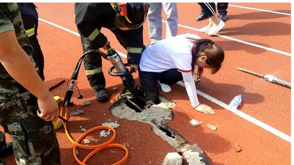 大連一高校塑膠跑道“暗藏陷阱” 女學生掉進洞中消防員緊急營救 2018-09-21