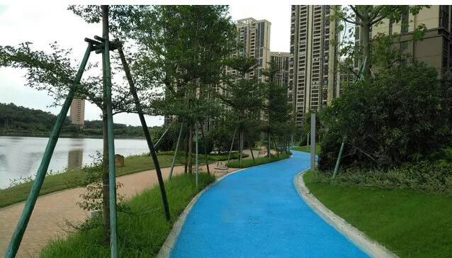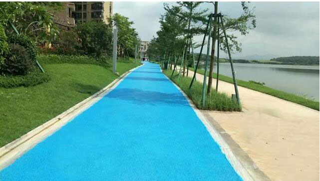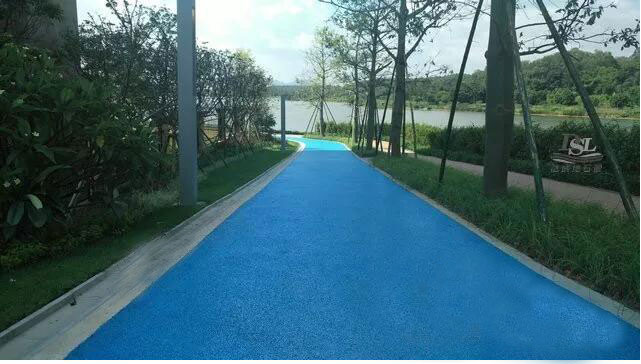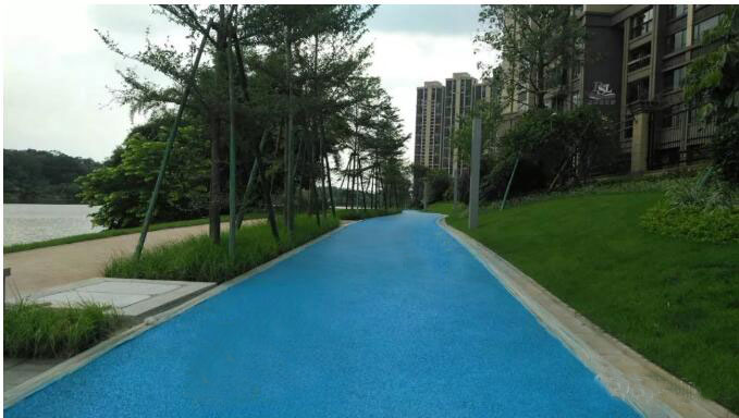 祝賀廣東佛山中信山語湖透水混凝土地坪項目竣工,達成地石麗小區(qū)透水地坪, 藍色透水混凝土地坪案例,藍色透水地坪案例是小區(qū)透水混凝土路面鋪裝經典案例。