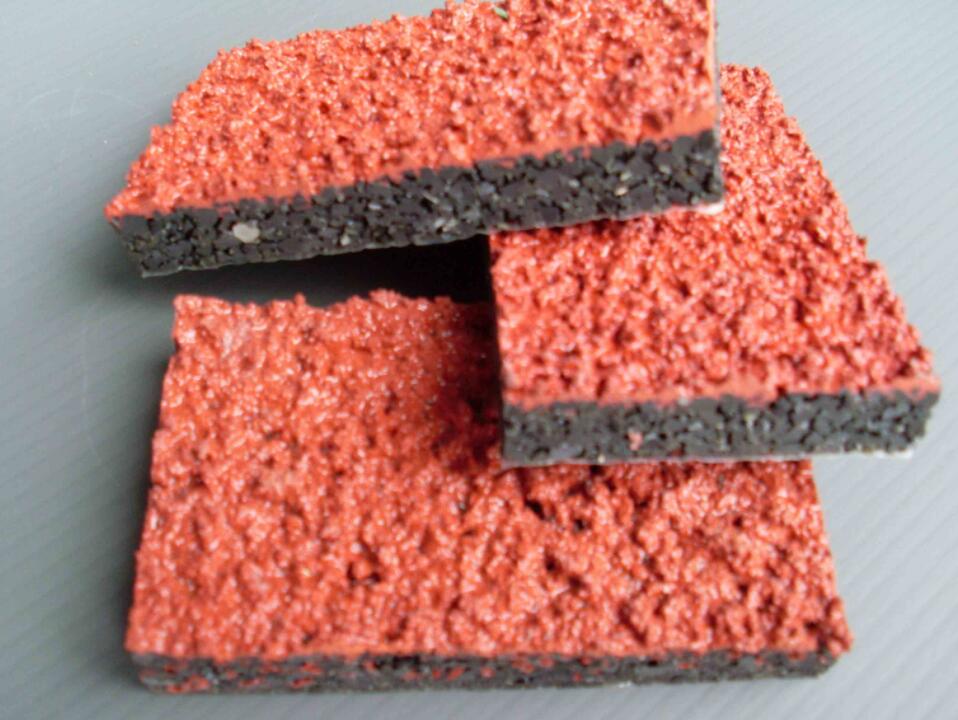4、面層采用EPDM(三元乙丙)橡膠膠料是與聚氨酯漿料、預(yù)聚體混合攪拌后,采用機(jī)械噴涂進(jìn)行施工不會(huì)掉粒,具有高度紫外線抵抗力,無褪色;