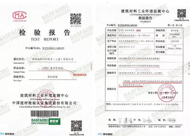 盡管該新國標(biāo)定于11月1日才開始強(qiáng)制執(zhí)行,但根據(jù)中國建材檢驗(yàn)認(rèn)證集團(tuán)(以下簡稱“國檢集團(tuán)”)CTC檢測中心提供的檢驗(yàn)報告,德國巴斯夫和上海都佰城的ETPU透水型跑道以及無溶劑聚氨酯膠粘劑等已按照新國標(biāo)全部項(xiàng)目檢測合格。