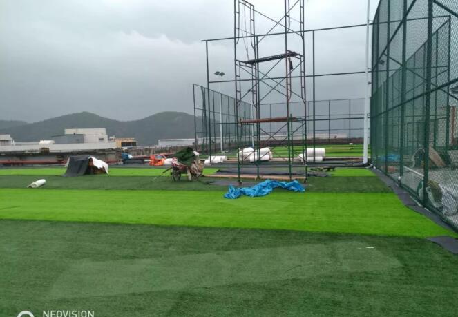 樓頂人造草足球場相比地面上足球場施工難度要大,主要是要把樓面的防水處理工作做好,另一方面是樓頂做球場最重要的就是安全問題,一般樓頂?shù)淖o(hù)欄高度為一米二左右,但是這個(gè)高度對(duì)于一個(gè)經(jīng)常使用且有球類運(yùn)動(dòng)的場地來說是遠(yuǎn)遠(yuǎn)不夠的,因此,還需安裝安全圍網(wǎng),必須要在6米以上,且具備防風(fēng)加固處理。