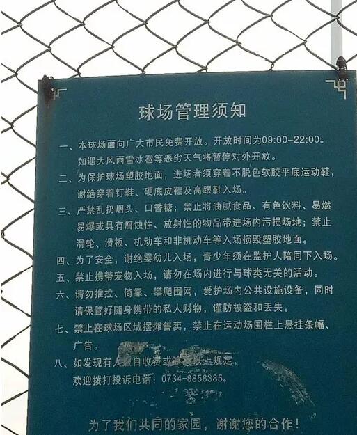 5月23日下午,記者在平湖公園入口處看到,顯眼位置張貼著的《球場(chǎng)管理須知》上明確寫著:為保護(hù)球場(chǎng)塑膠地面,謝絕穿著釘鞋、硬底皮鞋及高跟鞋入場(chǎng);禁止攜帶寵物入場(chǎng)。