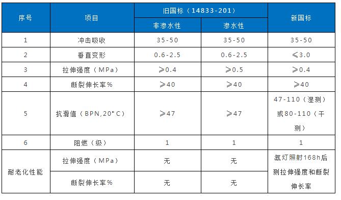 新國標(biāo)相對于GB/T19851.11-2005增加了合成材料運(yùn)動場地面層、現(xiàn)澆型面層、預(yù)制型面層、人造草、沖擊吸收、垂直變形、抗滑值、拉伸強(qiáng)度、拉斷伸長率、耐老化性能、阻燃性能、坡度、厚度等項(xiàng)目和指標(biāo)要求。這里只做了新國標(biāo)和GB/T14833-2011的對比: