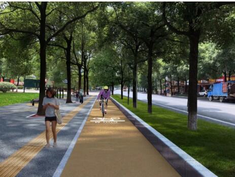 根據(jù)設(shè)計(jì)方案,慢行道將非機(jī)動車道與人行道設(shè)置在同一平面,兩者鋪裝不同顏色進(jìn)行視覺上的分割,解決機(jī)動車與非機(jī)動車混行的現(xiàn)狀。