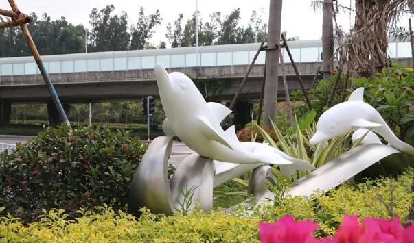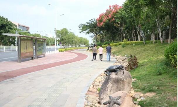 此外,施工方還在道路兩側(cè)新增21件大型雕塑作品,模型取材白鷺、白海豚等元素。項目還通過人行道改鋪透水磚、新建旱溪等,讓道路具備收集、儲蓄雨水的“海綿”功能。