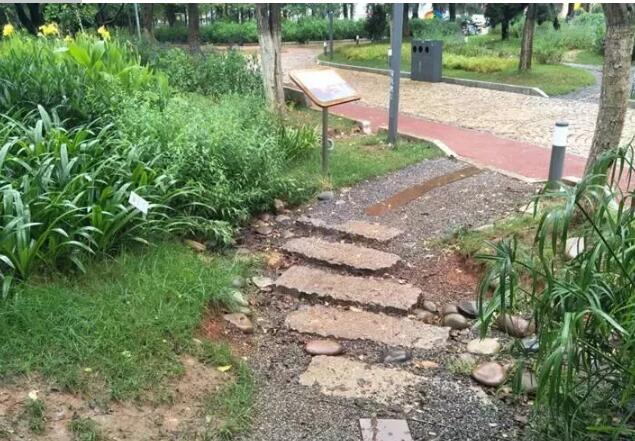改造前廣場鋪裝大多數(shù)為不透水鋪裝,產(chǎn)生徑流量較大?,F(xiàn)狀綠地大部分高出道路廣場,造成雨水難以進(jìn)入綠地;表層紅土之下的粘土透水性一般,不利于雨水滯留滲排。按照海綿城市建設(shè)要求進(jìn)行嚴(yán)謹(jǐn)?shù)挠嬎愫筒季?,項目共建設(shè)雨水花園462平方米,植草溝165平方米,生態(tài)滯留帶791平方米,濕塘和濕地180平方米,地下蓄水回用池300立方米,使用生態(tài)透水鋪裝1076平方米。實現(xiàn)了以下綜合目標(biāo):