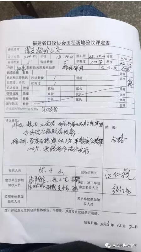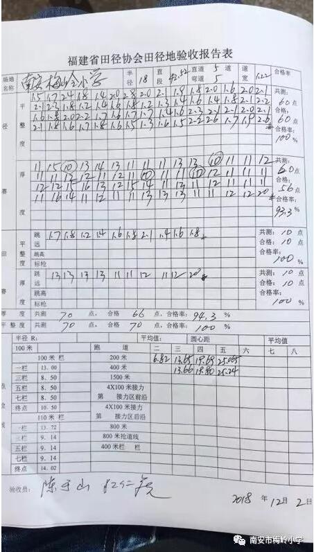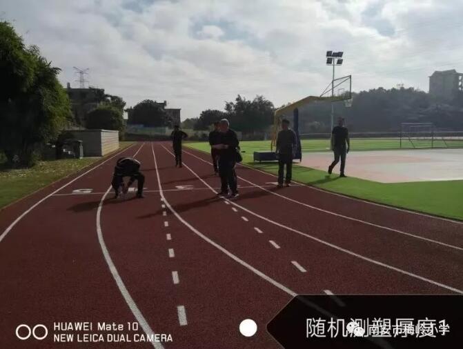 福建省田徑協(xié)會(huì)江處長,陳老師現(xiàn)場驗(yàn)收。跑道厚度測試60個(gè)點(diǎn),厚度合格56個(gè)點(diǎn),合格率94.3%;平整度測試60個(gè)點(diǎn),合格60個(gè)點(diǎn),合格率100%;點(diǎn)位線7測試7個(gè)點(diǎn),合格7個(gè)點(diǎn),合格率100%。