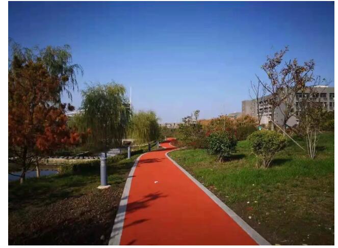 從啟真湖一路向南,跑過(guò)筆直的淺灰色公路,拐至圖書館正后方,便能看到步道在小山丘上蜿蜒,鮮艷的正紅色與濃郁的翠綠色交織輝映。不遠(yuǎn)處秦嶺向兩端綿延,在霧將散未散之時(shí),自有 “半山居霧若帶然”之感。