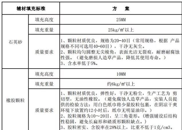 1、石英砂除表格中要求外,要求用石英砂而非河沙,粒徑適中,顆粒均勻,無灰塵和泥土,主要目的是保持松軟防止板結(jié)而影響場(chǎng)地彈性。