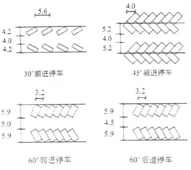 斜角式:即車輛與通道成斜交角度停放。一般按30°、45°、60°三種角度停放。采用這種形式,停車帶寬度隨車身長度和停放角度而異。斜角式適用于場地寬度受限制的停車場,車輛停放比較靈活,車輛駛?cè)牒婉偝龇奖?,可迅速停置和疏散?br />