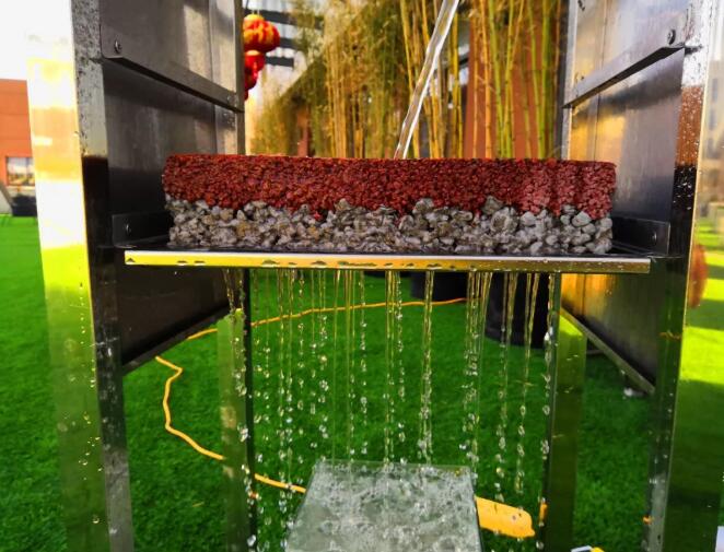 那么對(duì)于透水混凝土路面而言,雨水是依靠重力,通過透水混凝土層的不規(guī)則連續(xù)孔隙滲透,再進(jìn)入級(jí)配礫石層,再一次形成緩沖與分散,最終滲透到夯實(shí)的素土層中,整個(gè)過程安全可靠。下面的試驗(yàn)視頻,我們可以看到,從模擬的級(jí)配礫石層出來的水是分散的珠狀 這個(gè)道理,我們也可以簡化聯(lián)想一下,有喜愛養(yǎng)花的朋友經(jīng)常會(huì)用到噴壺。
