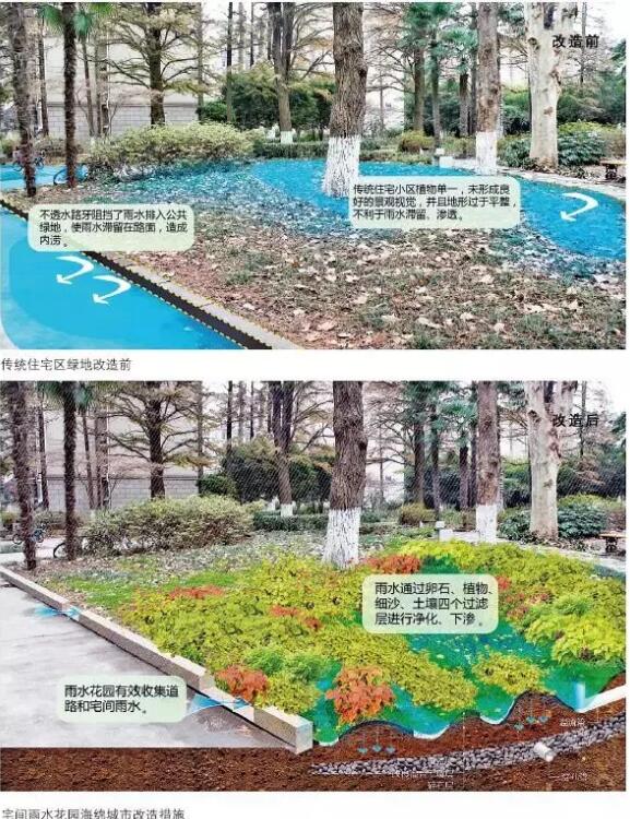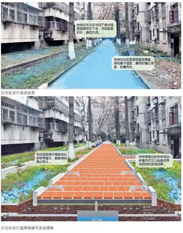 傳統(tǒng)住宅區(qū)中的宅間道路和綠化帶可以改造成透水路面和生物滯留池,用來收集道路上的雨水,避免路面雨水沉積對居民生活造成影響。