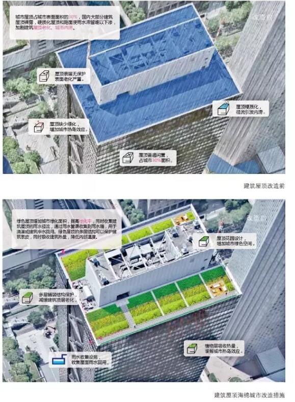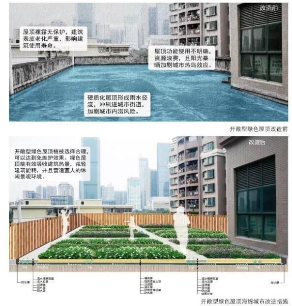 雨洪來臨時,建筑屋頂產(chǎn)生的徑流是導(dǎo)致城市內(nèi)澇的重要原因之一。因此,將城市的建筑屋頂改造為綠色屋頂能有效緩解城市雨水徑流壓力。一方面,通過海綿城市結(jié)構(gòu)來收集、儲存雨水,并利用雨水進行澆灌,可以節(jié)省各種能耗;另一方面,綠色屋頂將形成良好的城市景觀,提升城市的整體綠化率。