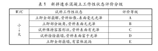 制備工藝對透水混凝土的性能具有多方面的影響,如水泥裹石法、“濕—濕”工藝、上置式振動成型法分別可對其抗壓強度、強度均勻性、孔隙率以及平整度等性能做出不同程度的調(diào)整。在比較了不同的透水混凝土成型工藝后,張賢超發(fā)現(xiàn)采用漿體裹石法之后的透水混凝土,其抗壓強度能得到 10% 的提高,透水率及其他基本性能也得到了明顯改善。秦旭朝研究了新拌透水混凝土的工作性狀態(tài),結(jié)合其表觀性狀和結(jié)構(gòu)特點對其工作性狀態(tài)提出了一種評價分級體系,見表1;其中代表著水泥漿稠度過大,難以均勻包覆粗骨料的等級“A”和“B”,以及代表著水泥漿太稀,難以穩(wěn)定膠結(jié)于粗骨料上的等級“D”和“E”均是不合格的。只有等級“C”方能合格。