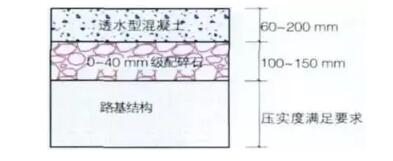 透水混凝土作為環(huán)境負(fù)荷減少型混凝土,除卻透水效果良好、雨水收集充足等功能外,兼具吸聲降噪、抗洪澇災(zāi)害、緩解城市“熱島效應(yīng)”等作用。透水路面結(jié)構(gòu)形式從上而下依次為素土夯實、級配碎石、60~120mm透水混凝土,具體如下:
