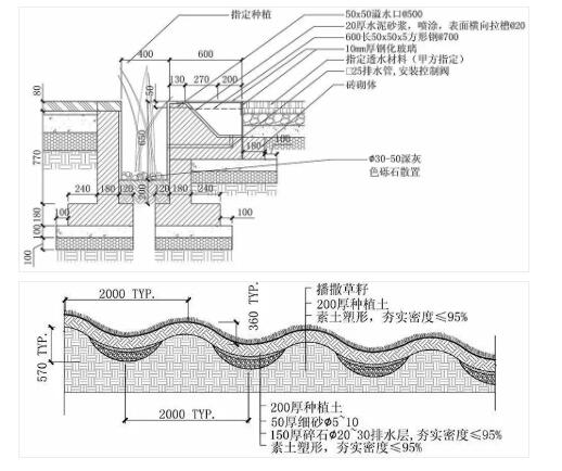 (2)用植草格或孔形混凝土磚進(jìn)行鋪裝,材料本身不具透水性,制作成品的樣式為孔洞形,一般都能達(dá)到 40%以上的孔洞率,可進(jìn)行植草。