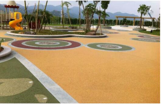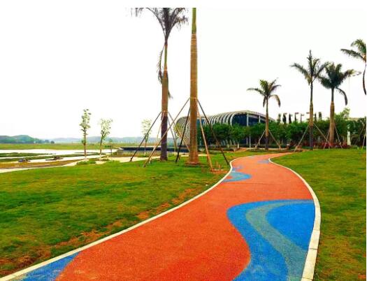 在旅游景區(qū)環(huán)境中,透水塑膠主要用于慢行騎車道或兒童活動(dòng)場(chǎng)地,面層材料往往選用本具有良好透水性的EPDF顆粒,厚度10~15mm,基層采用粗料透水混凝土,厚度根據(jù)不同地區(qū)地質(zhì)條件而定。