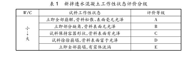 制備工藝對透水混凝土的性能具有多方面的影響,如水泥裹石法、“濕—濕”工藝、上置式振動(dòng)成型法分別可對其抗壓強(qiáng)度、強(qiáng)度均勻性、孔隙率以及平整度等性能做出不同程度的調(diào)整。在比較了不同的透水混凝土成型工藝后,張賢超發(fā)現(xiàn)采用漿體裹石法之后的透水混凝土,其抗壓強(qiáng)度能得到 10% 的提高,透水率及其他基本性能也得到了明顯改善。秦旭朝研究了新拌透水混凝土的工作性狀態(tài),結(jié)合其表觀性狀和結(jié)構(gòu)特點(diǎn)對其工作性狀態(tài)提出了一種評價(jià)分級(jí)體系,見表1;其中代表著水泥漿稠度過大,難以均勻包覆粗骨料的等級(jí)“A”和“B”,以及代表著水泥漿太稀,難以穩(wěn)定膠結(jié)于粗骨料上的等級(jí)“D”和“E”均是不合格的。只有等級(jí)“C”方能合格。
