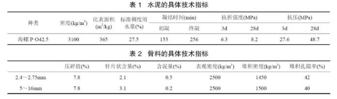 (1)水泥:由于透水混凝土是基于碎石間粘結(jié)力的增強(qiáng)來達(dá)到強(qiáng)度要求的,所以宜選用P·O42.5 級(jí)水泥,具體指標(biāo)如表 1 所示。