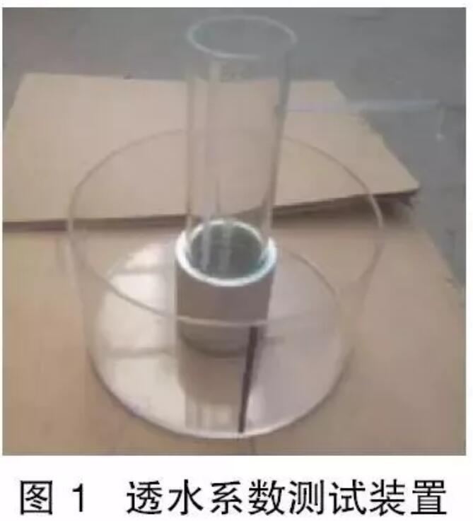 此次彩色透水混凝土依據(jù) CJJT 135—2009《透水水泥混凝土路面技術(shù)規(guī)程》進(jìn)行配合比設(shè)計(jì)及試驗(yàn)??箟簭?qiáng)度依據(jù)GB/T 50081—2002《普通混凝土力學(xué)試驗(yàn)方法》的有關(guān)規(guī)定測(cè)試,透水系數(shù)采用“固定水量法”進(jìn)行測(cè)試,測(cè)試裝置如圖 1 所示。
