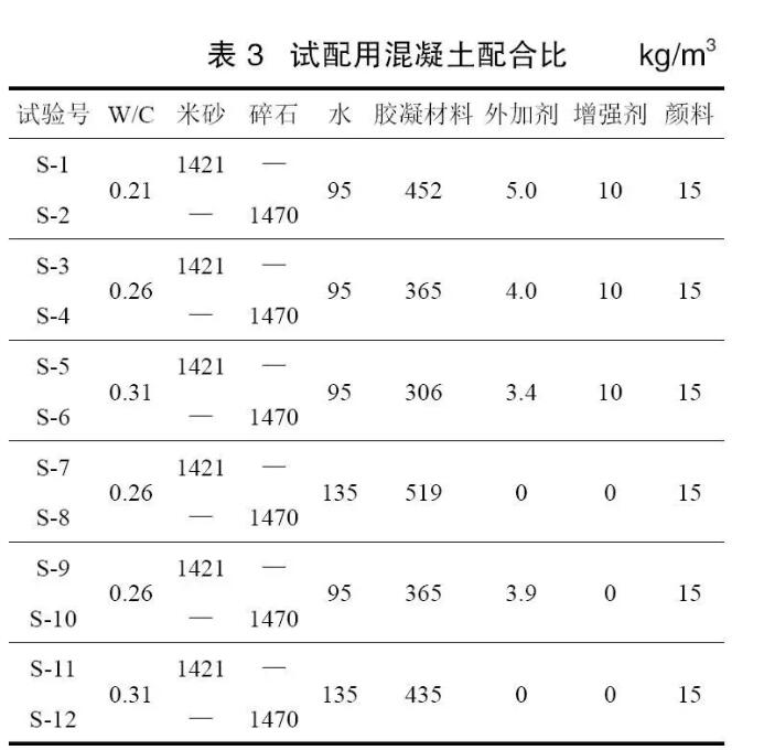 依據(jù) CJJT 135—2009 規(guī)程的要求,在試配時(shí)水灰比上下浮動(dòng)0.05,并相應(yīng)的調(diào)整膠凝材料及外加劑的用量,進(jìn)行配合比試驗(yàn),水灰比分別選擇 0.21、0.26 和0.31,具體配合比如表 3 所示。