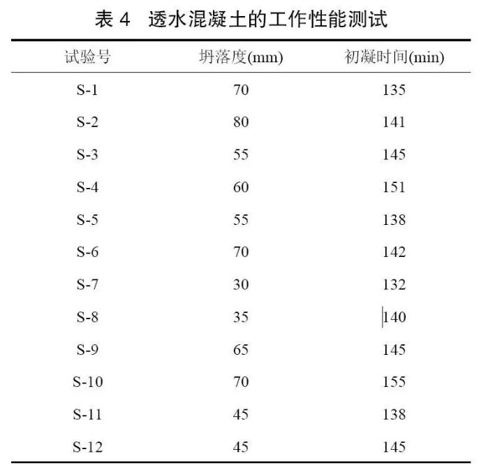 通過試配發(fā)現(xiàn),水泥用量較高的透水混凝土凝結(jié)時(shí)間較短,且漿體較多,坍落度明顯偏大,孔隙易堵塞,導(dǎo)致混凝土透水系數(shù)降低;不用減水劑的和增強(qiáng)劑的混凝土坍落度太小,不利于混凝土的施工和成型。表4 中的數(shù)據(jù)對(duì)比可以看出試驗(yàn)序號(hào)為 S3 和 S4 的混凝土工作性能較為理想。