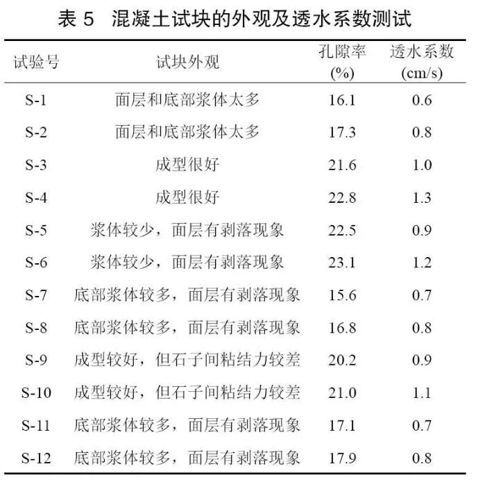 對(duì)硬化后的混凝土試塊進(jìn)行表觀檢查,并測(cè)試混凝土的孔隙率以及透水系數(shù),測(cè)試結(jié)果如表5 所示。
