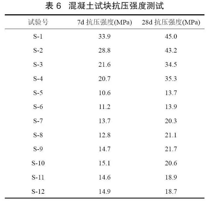 對(duì)硬化后的混凝土試塊進(jìn)行抗壓強(qiáng)度測(cè)試,測(cè)試結(jié)果如表6 所示。