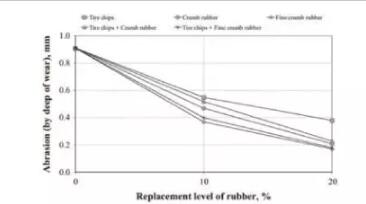 有研究指出加入橡膠的透水混凝土表現(xiàn)出優(yōu)良的耐磨性能,如圖5所示。由圖5可以看出,增大橡膠摻量可以系統(tǒng)的提高透水混凝土的耐磨性能,這可能是因為纖維持有橡膠的能力可以保證水泥的完整性,這種完整性有利于透水混凝土的抗磨性能[25],表面骨料不容易因為磨損剝落。