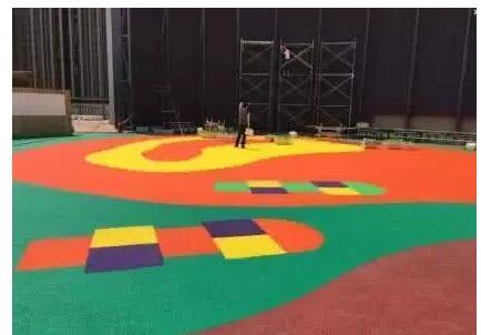 面層:采用粒徑1-3mmEPDM彩色顆粒添加高強(qiáng)度單組份膠水,攪伴均勻,攤鋪厚度為5mm。
