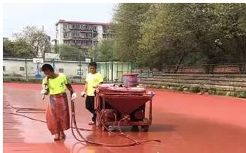 施工方法:將自結紋面漆按(面漆A:面漆B:催化劑=1:2:A*(0.3-0.5)%)攪拌均勻,加入石英砂,紅膠粉,稀釋劑,攪拌均勻,然后倒入噴涂機開始噴面,然后將漿料倒入專業(yè)噴涂器里,噴涂時噴嘴離地面應保持在1.5米以上,并不斷均勻地移動,以達到顆粒均勻散布,不可噴厚或漏噴(注意第一次和第二次依次噴涂的方向要相反,這樣可保證面層均勻一致)