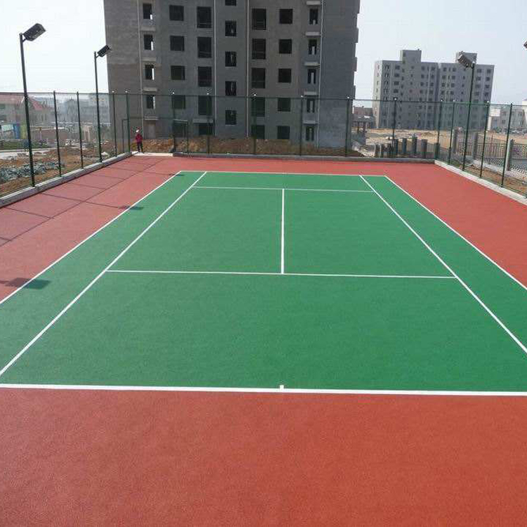 2、中涂層(兩道):一種不含石棉.與石英砂混合使用的丙烯酸乳液鋪涂層,具有滲透性好、強度大的特點。能增強場地的強度、平整度和使用壽命。