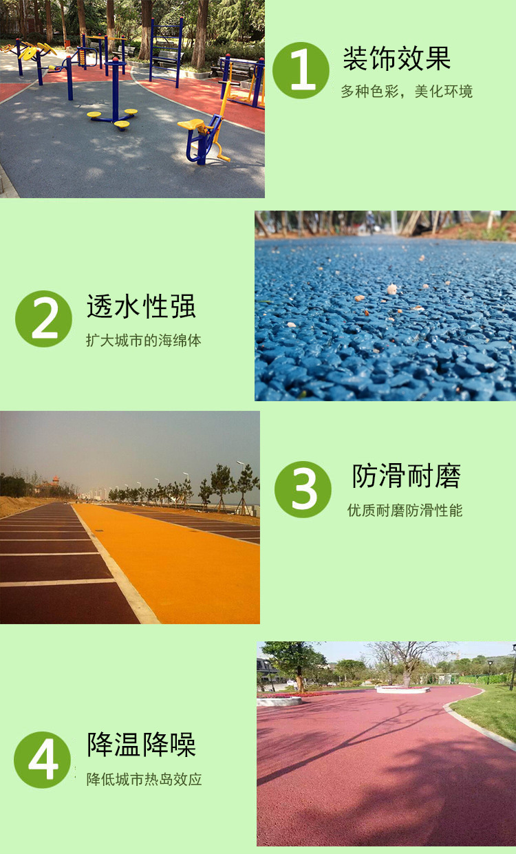 彩色透水混凝土不僅有裝飾美觀的作用,且色彩繽紛可以景觀相融合,使城市環(huán)境建設(shè)更加和諧,是保護(hù)自然、維護(hù)生態(tài)平衡、緩解城市熱島效應(yīng)的一種優(yōu)良海綿城市透水地坪材料。在城市雨水管理與水污染防治等工作上,具有極其深遠(yuǎn)的意義,有利于人類生存環(huán)境的良性發(fā)展。
